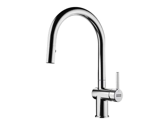 Armatur mit Auszugsbrause, ermöglicht neben den Vorteilen einer Zugauslaufarmatur unterschiedliche Strahlarten in verschiedenen Intensitäten (Normal- und Nadelstrahl),“>