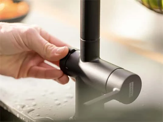 Durch diese innovative Besonderheit ist die Armatur über einen integrierten Drehknopf direkt mit der Spüle verbunden. Dieser betätigt beim Drehen den Abfluss, sodass das Wasser, einfach, sicher und hygienisch abläuft. Somit wird keine separate Lochbohrung für die Ventilbetätigung benötigt.