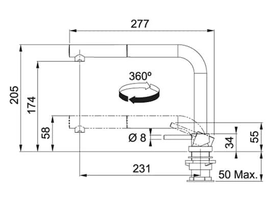 - Vorfenstermotage: Armatur lässt sich bis auf eine geringe Resthöhe in der Areitsplatte oder Spüle versenken.