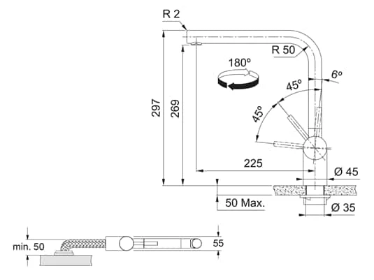- Schwenkbereich der Armatur: 180°