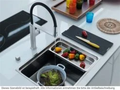 Vollendete Ergänzungen sind die im Design auf das jeweilige Spülenmodell abgestimmten Armaturen. Praktisch wie arbeitstechnisch ideal erweisen sich die ergonomisch durchdachten Einhebelmischer mit ausziehbarer Schlauchbrause.
