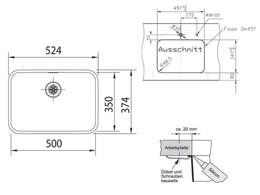 Das Becken wird von unten mit der ausgeschnittenen Arbeitsplatte verschraubt und verklebt. Unterbau ist bei Platten aus Vollmaterial (Stein, Kunststoff, Holz) nicht aber bei Platten mit Kuntststoff-Beschichtung möglich. Der Unterbau kann bündig erfolgen oder mit vorspringendem Becken zur Aufnahme von Zubehör. Unterbau passt zu besonders hochwertigen Plattenmaterialien und zu eleganter Küchengestaltung.“>