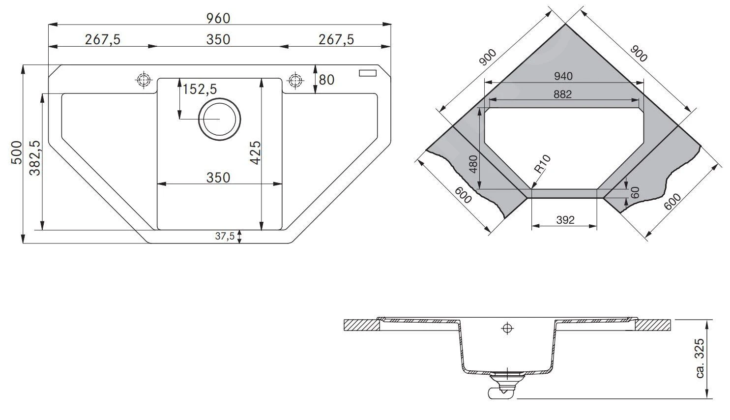 – platzsparendes Siphon 6/4“ mit Abzweigung zum Geschirrspüler