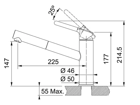 Verfügbare Schlauchlänge von Unterkante der Armatur bis zu den Anschlüssen.“ src=““ data-src=“//value.moebelplus.de/features/franke_schlauchlaenge.gif“ alt=“Schlauchlänge 450 mm