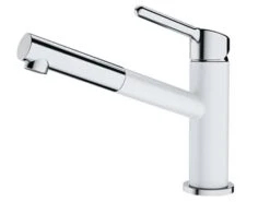 Die Armatur hat einen herausziehbaren Zugauslauf mit Normalstrahl für mehr Reichweite und Flexibilität.“>