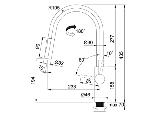 Verfügbare Schlauchlänge von Unterkante der Armatur bis zu den Anschlüssen.“ src=““ data-src=“//value.moebelplus.de/features/franke_schlauchlaenge.gif“ alt=“Schlauchlänge 450 mm