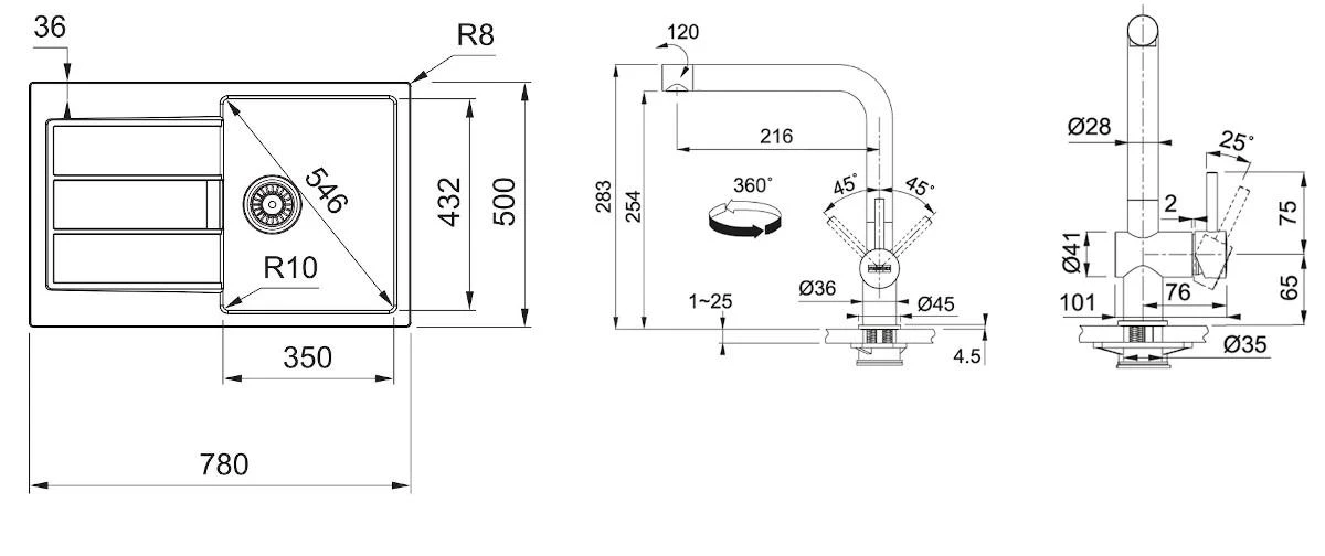 - platzsparendes Siphon 6/4“ mit Abzweigung zum Geschirrspüler