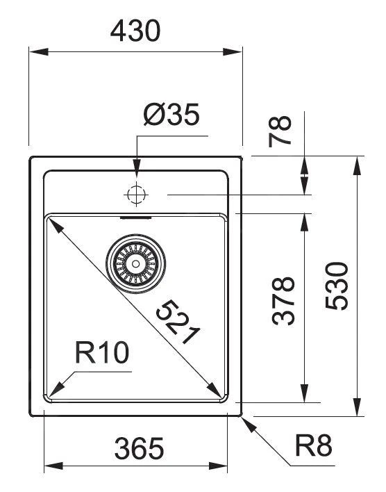 - Abmessungen des Spülbeckens: 365 x 378 x 200 mm