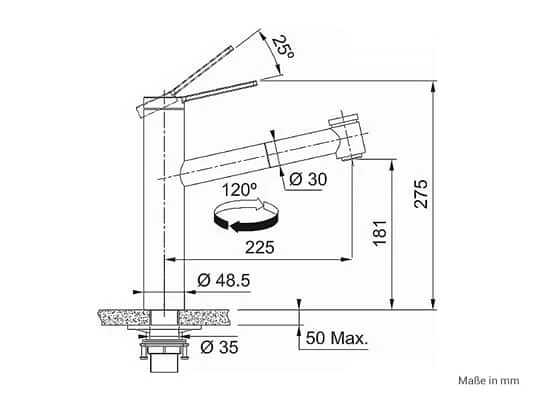 - Schwenkbereich der Armatur: 120°