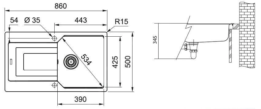 - Abmessungen der Spüle 390 x 425 × 220 mm